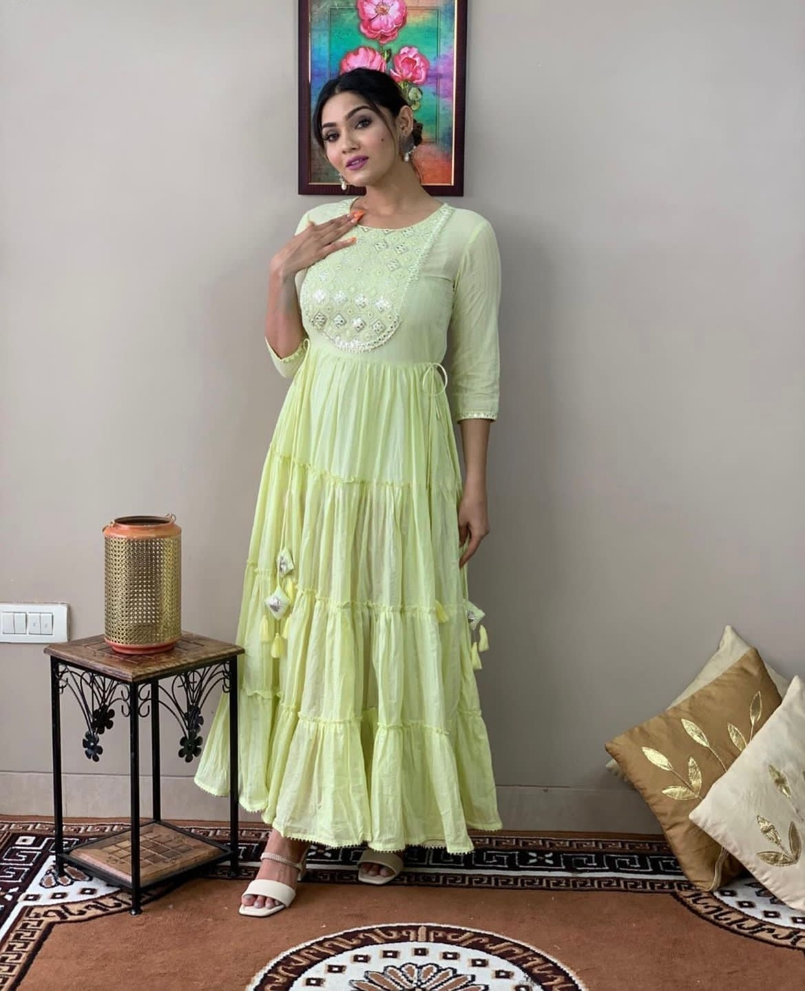 Introducing our exquisite Light Green Floral Embroidered Rayon Lurex Long Gown, a mesmerizing piece that exudes elegance and charm. This stunning gown features a beautiful floral pattern embroidery in the yoke, adding a touch of femininity and grace. The intricate details are complemented by delicate gota lace, enhancing the overall appeal.