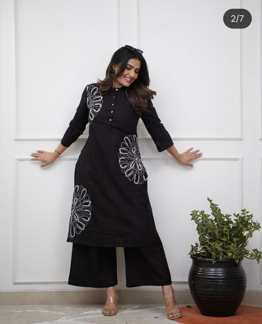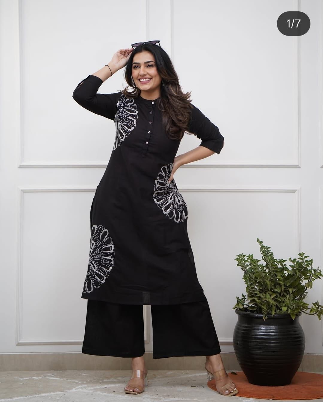 Elevate your everyday style with this sophisticated black Kurti and pant set. Crafted from breathable cotton fabric and adorned with delicate embroidery, this ensemble offers both comfort and elegance. Perfect for casual outings or light festive occasions.