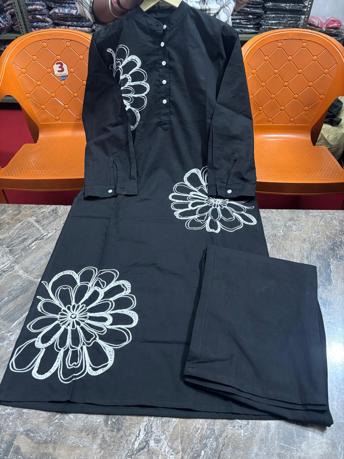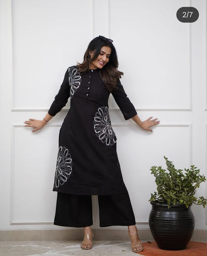 Black Embroidered Cotton Kurti Pant Set with 3/4 Sleeves