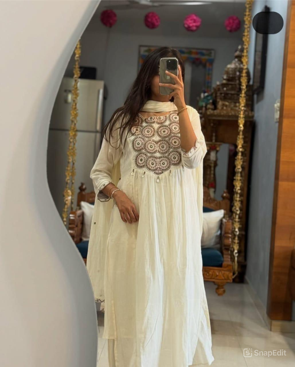 Step into a world of timeless elegance with our stunning flared Anarkali kurta set. This beautiful ensemble is crafted from breathable cotton, ensuring comfort and grace for any occasion. The kurta features a flattering tier pattern that adds a touch of playful sophistication to the traditional Anarkali silhouette. The yoke is exquisitely detailed with intricate embroidery and delicate "pitten work," a traditional technique that adds a unique and artistic flair. Paired with comfortable cotton pant and a soft, airy malmal dupatta, this set is the perfect blend of classic style and contemporary design. Whether you're attending a festive celebration, a casual get-together, or simply want to elevate your everyday ethnic wear, this Anarkali kurta set is sure to make you feel effortlessly beautiful.