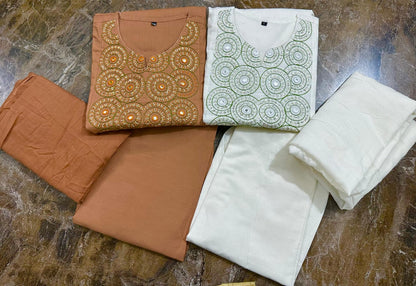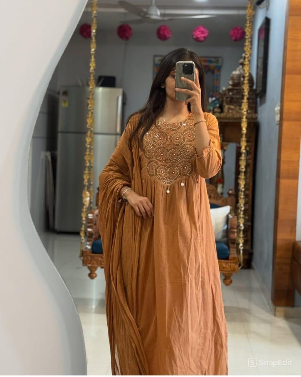 Step into a world of timeless elegance with our stunning flared Anarkali kurta set. This beautiful ensemble is crafted from breathable cotton, ensuring comfort and grace for any occasion. The kurta features a flattering tier pattern that adds a touch of playful sophistication to the traditional Anarkali silhouette. The yoke is exquisitely detailed with intricate embroidery and delicate "pitten work," a traditional technique that adds a unique and artistic flair. Paired with comfortable cotton pant and a soft, airy malmal dupatta, this set is the perfect blend of classic style and contemporary design. Whether you're attending a festive celebration, a casual get-together, or simply want to elevate your everyday ethnic wear, this Anarkali kurta set is sure to make you feel effortlessly beautiful.