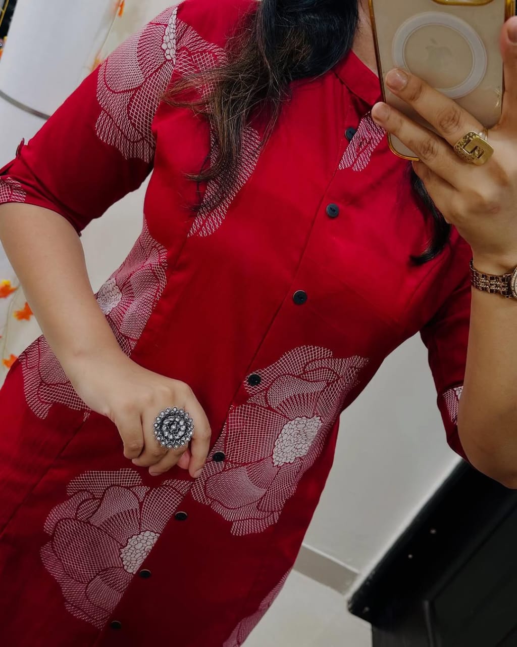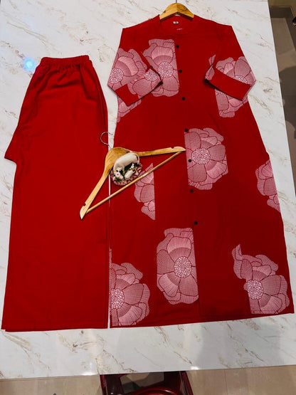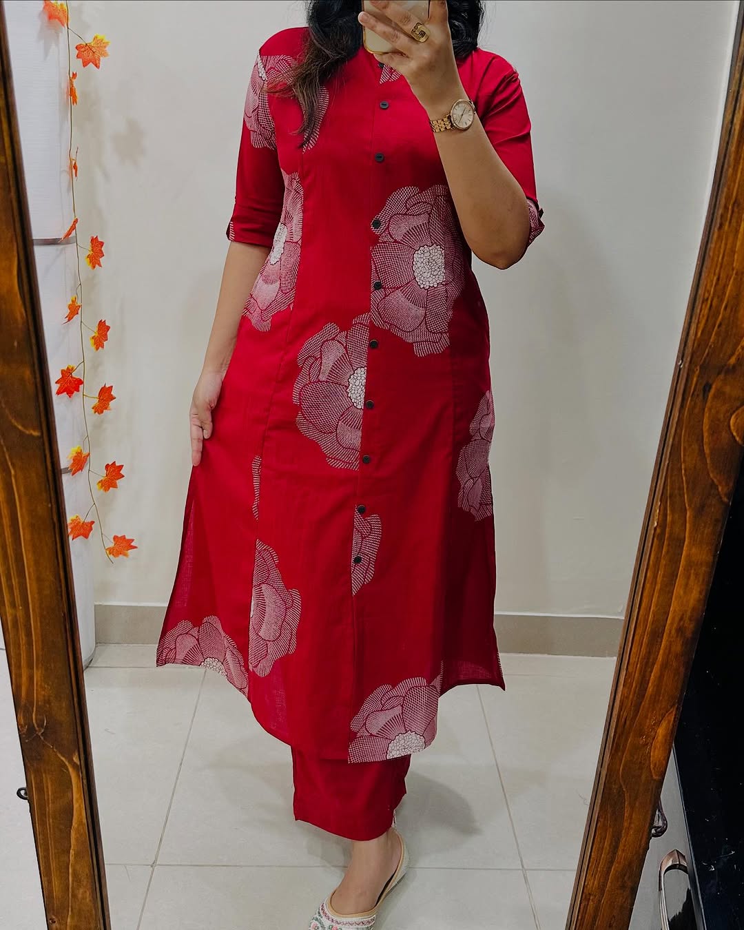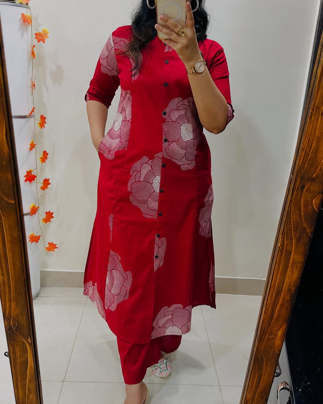 Effortlessly chic and endlessly comfortable, this floral cotton co-ord set is your new go-to ensemble for breezy style. Featuring a flattering A-line kurti paired with a contemporary ankle-length palazzo pant, this set is crafted from premium Cotton 60,60 fabric for a soft, breathable feel that lasts all day.