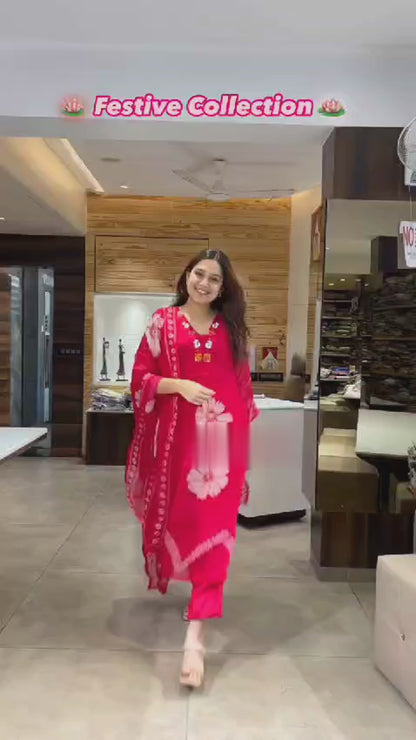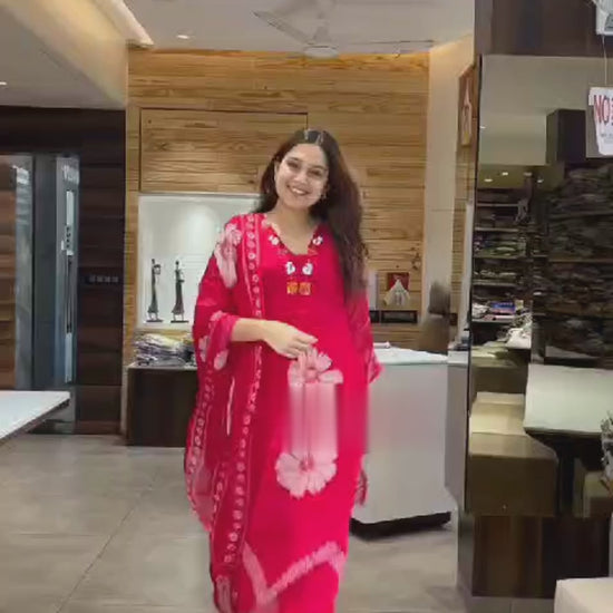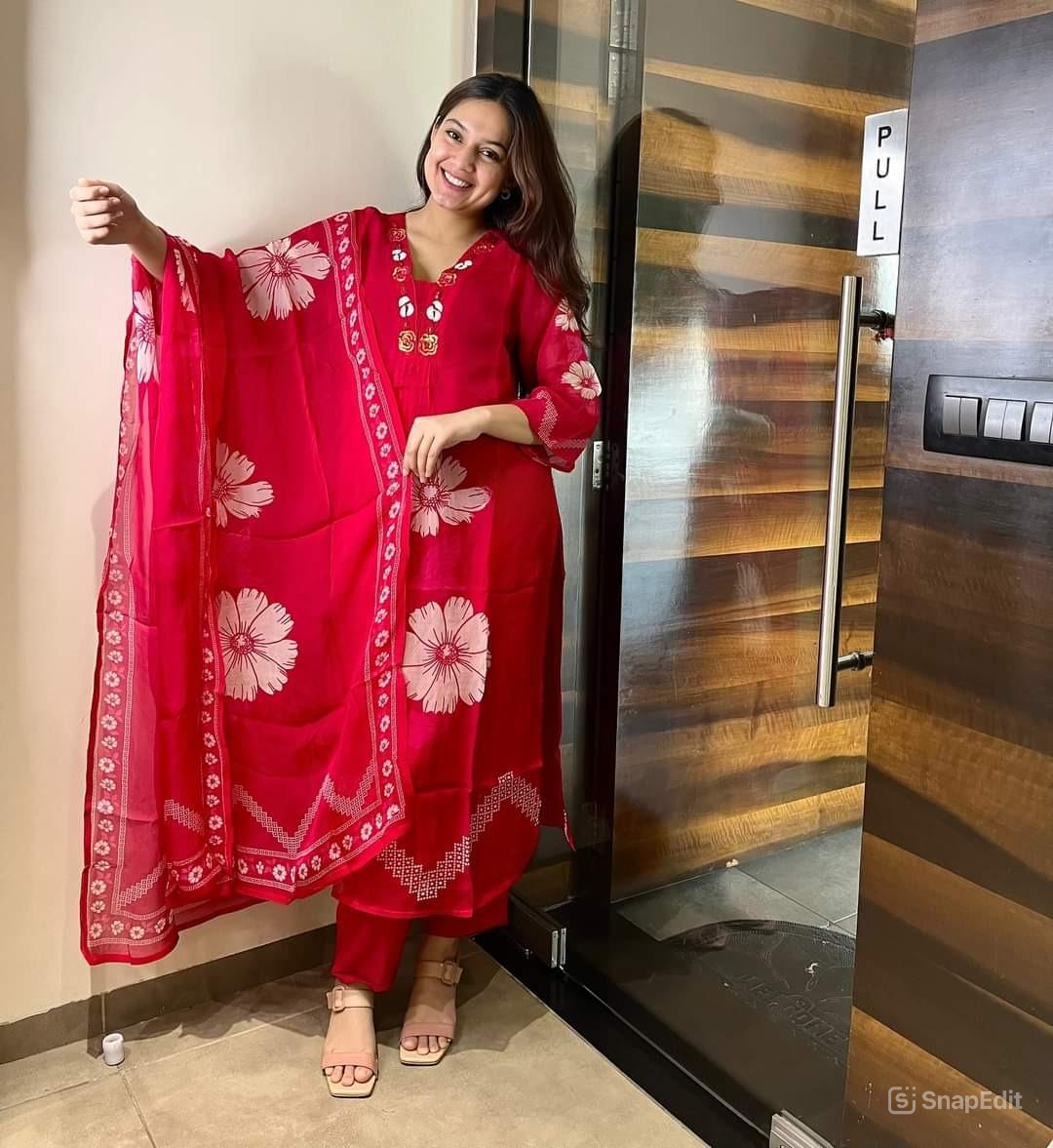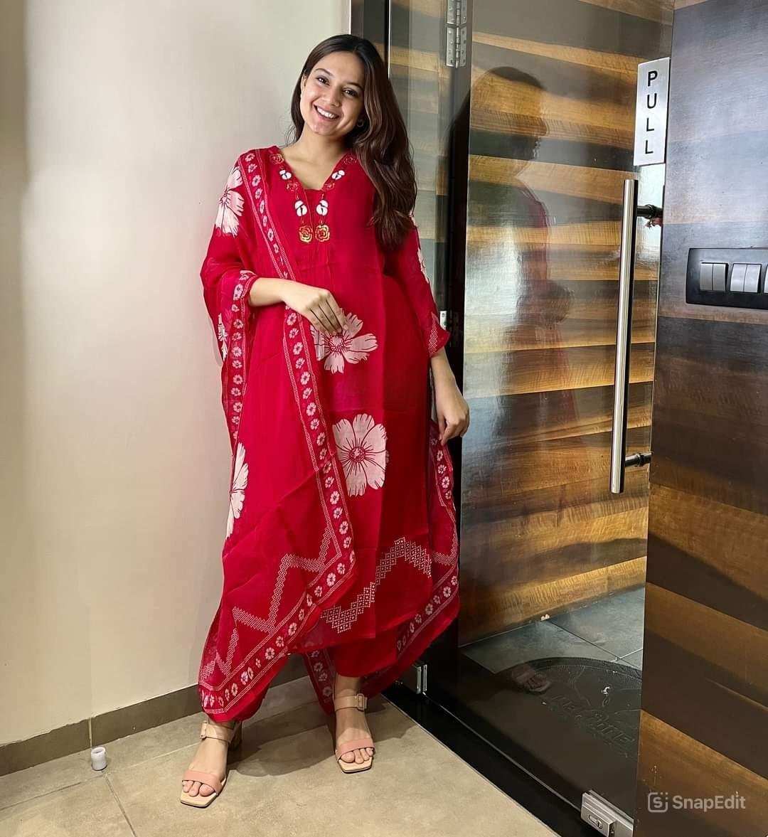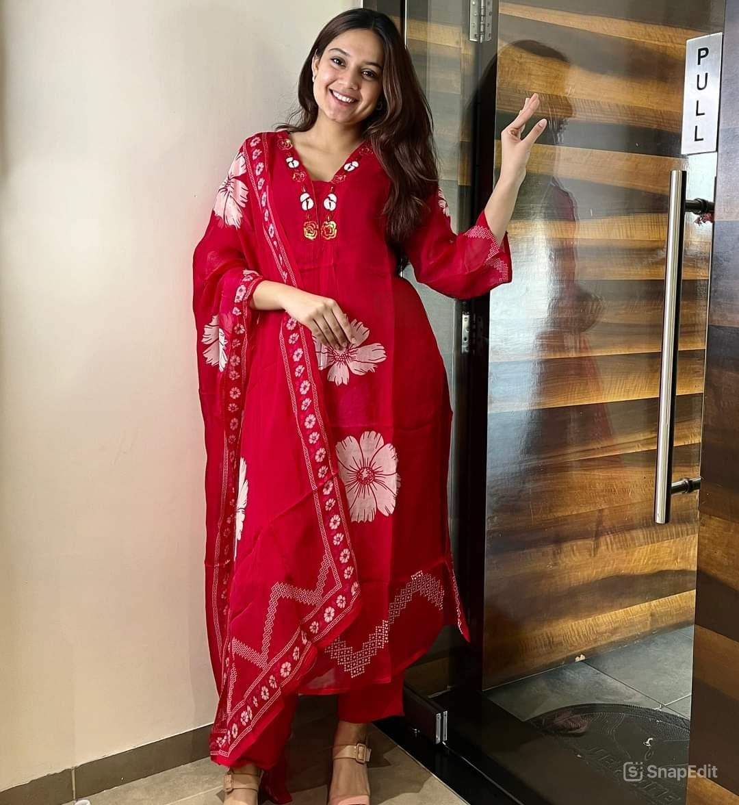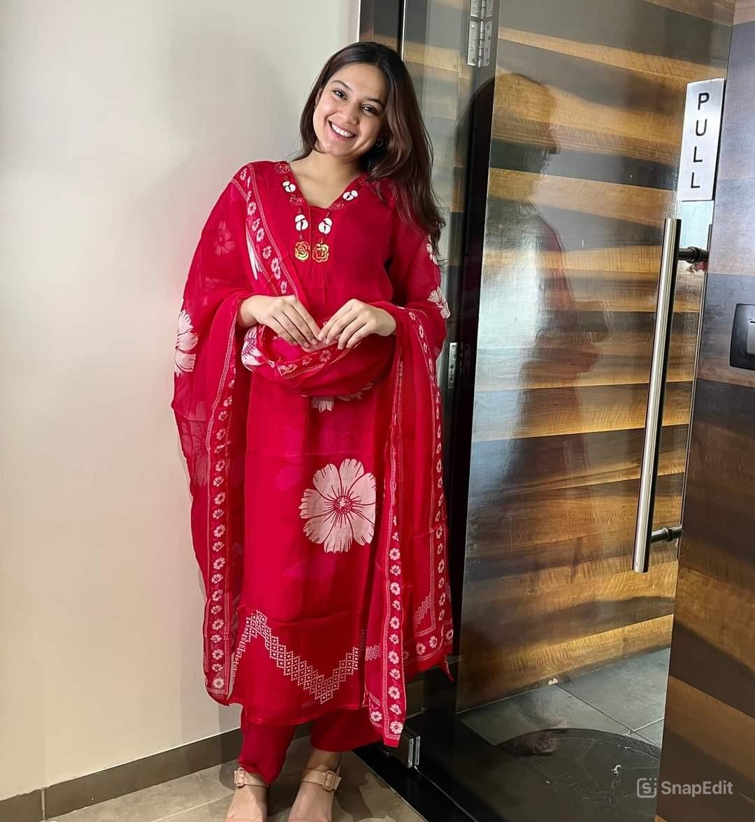 Elevate your ethnic wardrobe with this elegant red floral print cotton kurti set, perfect for everyday wear or casual outings. Crafted from premium 60x60 cotton fabric, this set offers all-day comfort with a stylish touch. The yoke work on the kurti adds a refined detail, while the soft malmal dupatta enhances the overall grace of the outfit.