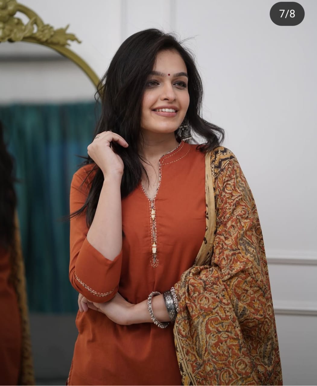 Elevate your ethnic style with this elegant cotton slub Kurti set featuring detailed Katha thread work and a beautifully designed digital print Chanderi dupatta with gotta lace. Perfect for festive wear, office, or casual outings, this set blends comfort with grace.