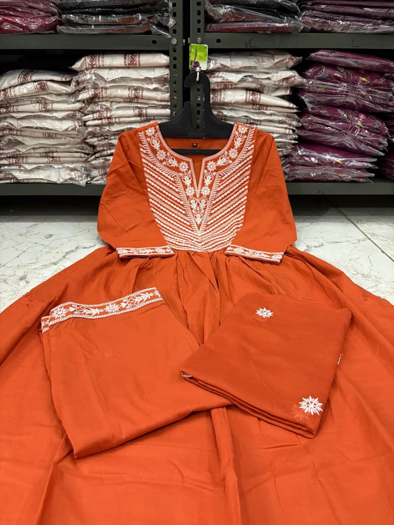 Cotton Embroidered Anarkali Suit Set with Pant & Dupatta