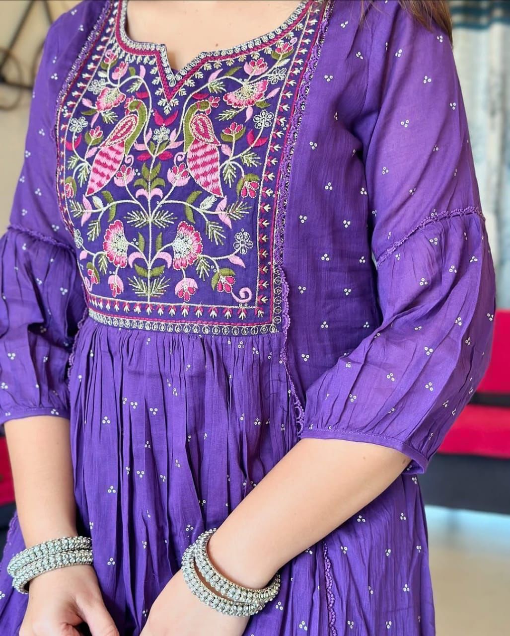 - Elegant flared Anarkali kurta set with a graceful tier pattern