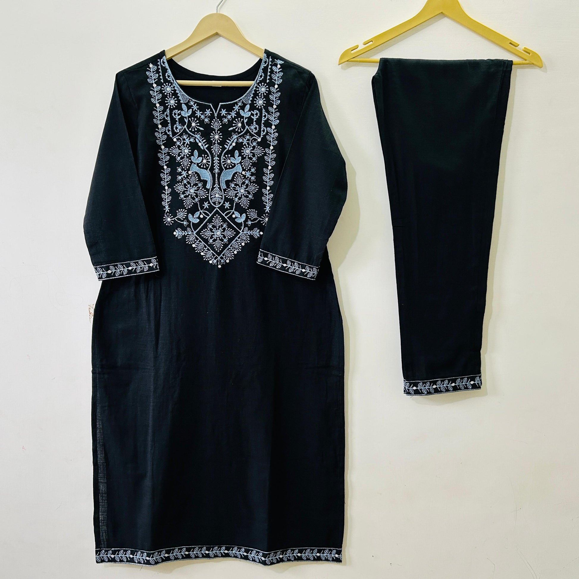Handloom Embroidered Kurti Pant Set with Baatik Print Silk Dupatta