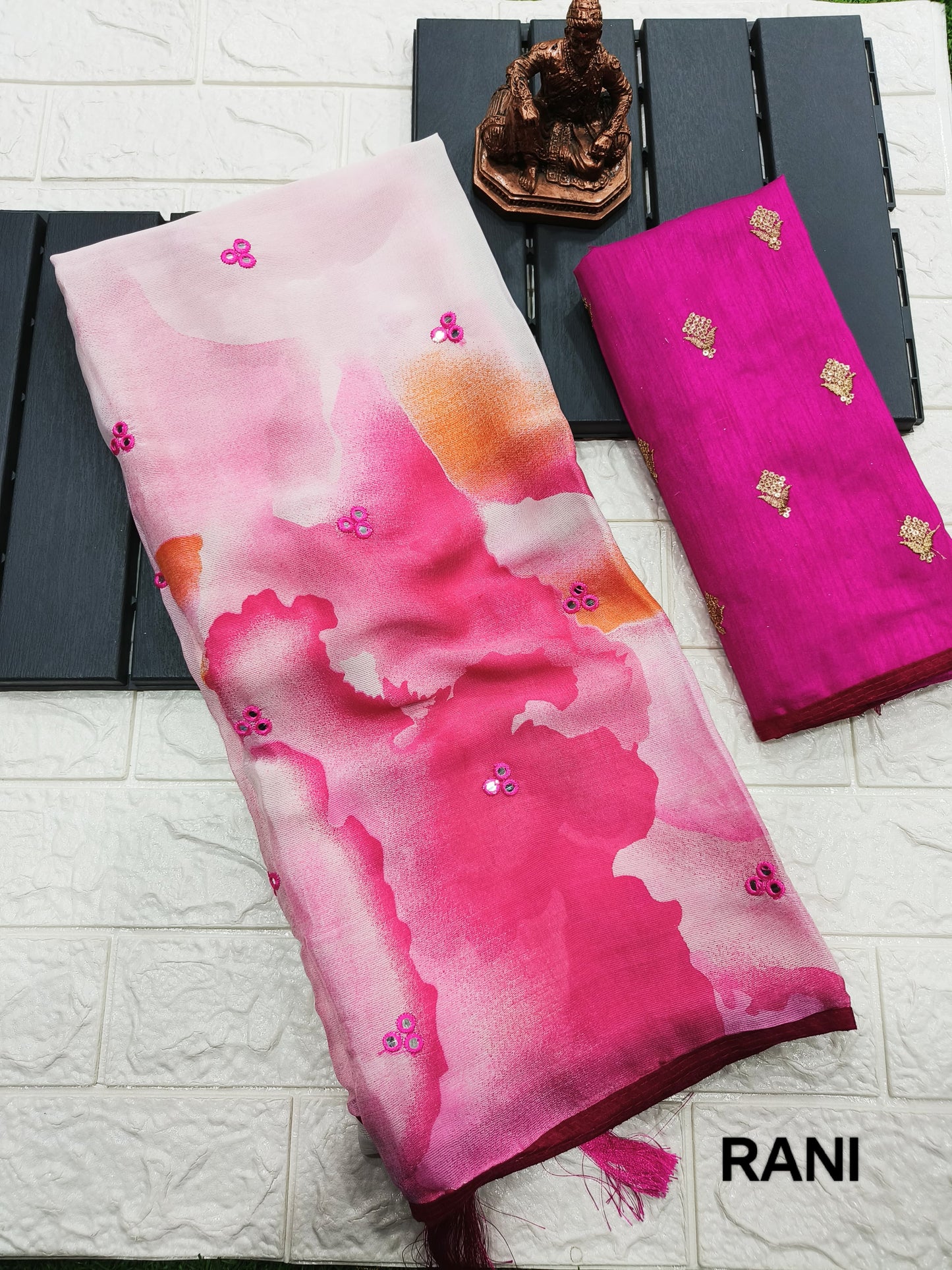 • Delicate Mirror Work: Adorned with delicate mirror work, this saree adds a touch of elegance and glamour to your look.