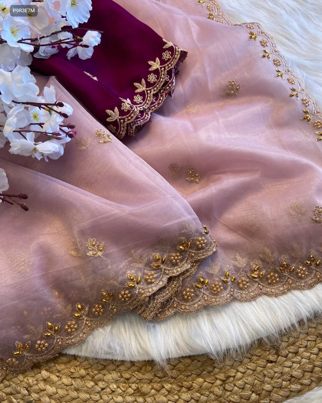 Organza Saree with Beadwork and Embroidery - Includes Matching Blouse Piece