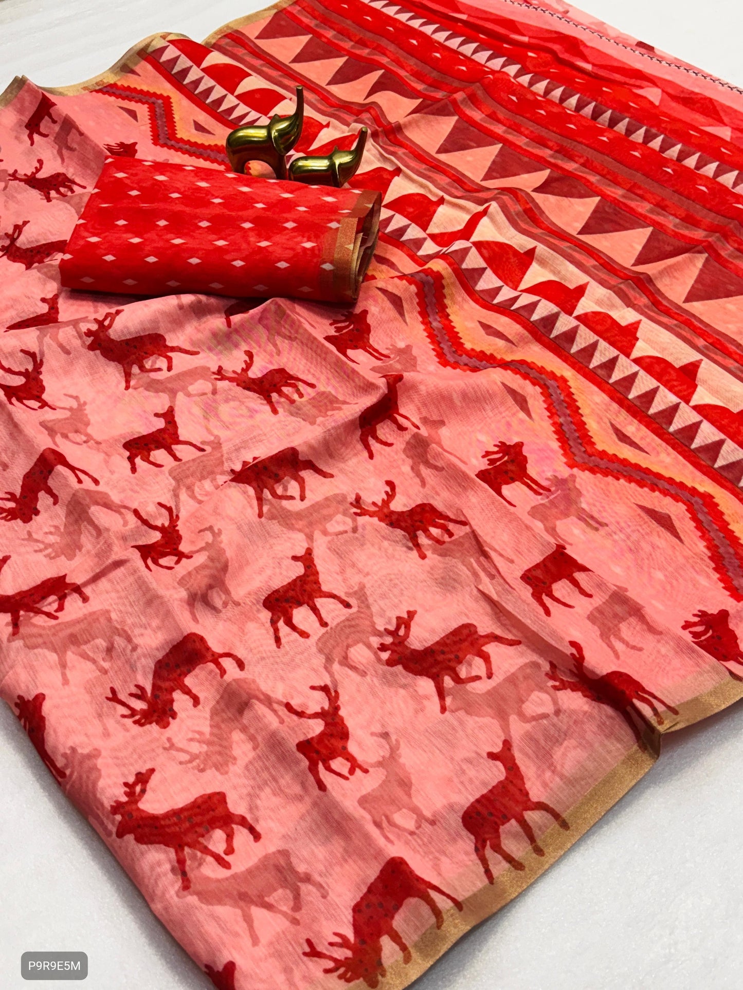 Malai Cotton Saree with Zari Border & Printed Blouse