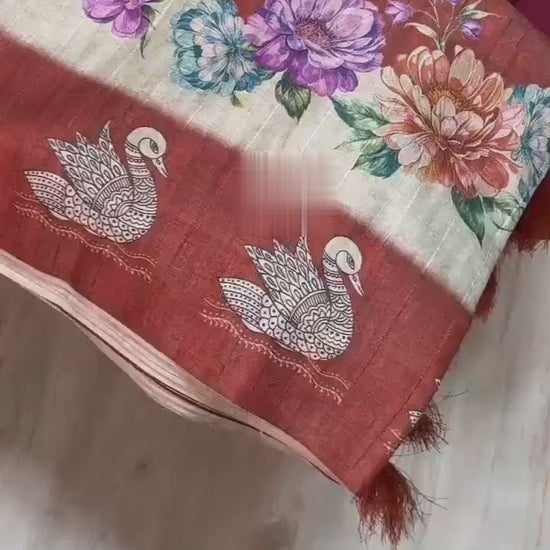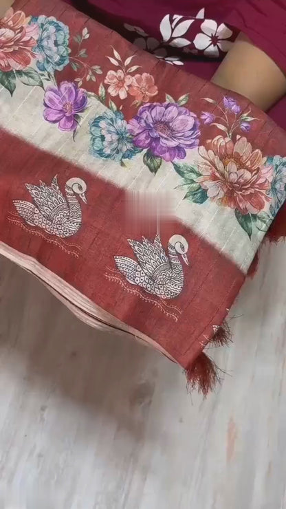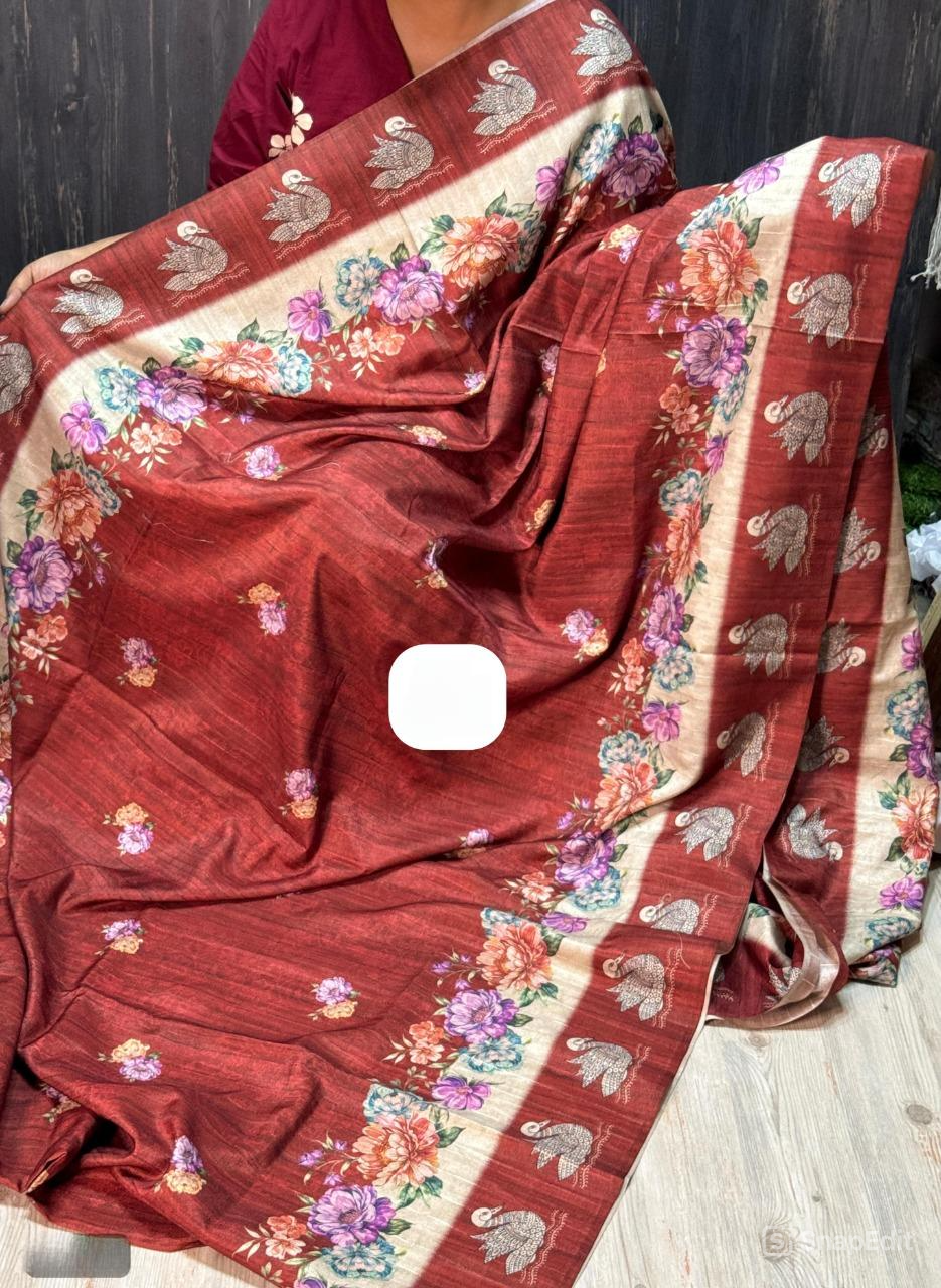 Tussar Silk Saree with Tulip Digital Print & Arco Border – With Blouse Piece & Pallu