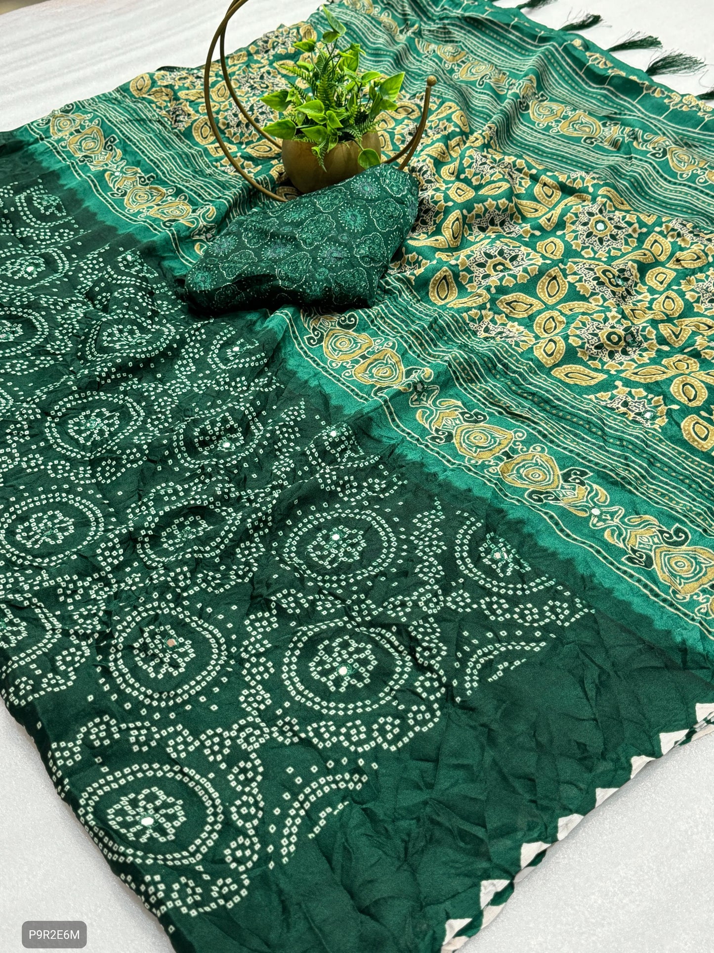 Kalamkari Bandhej Moss Saree with Mirror Work & Zhumka Pallu | Bandhani Saree with Running Blouse
