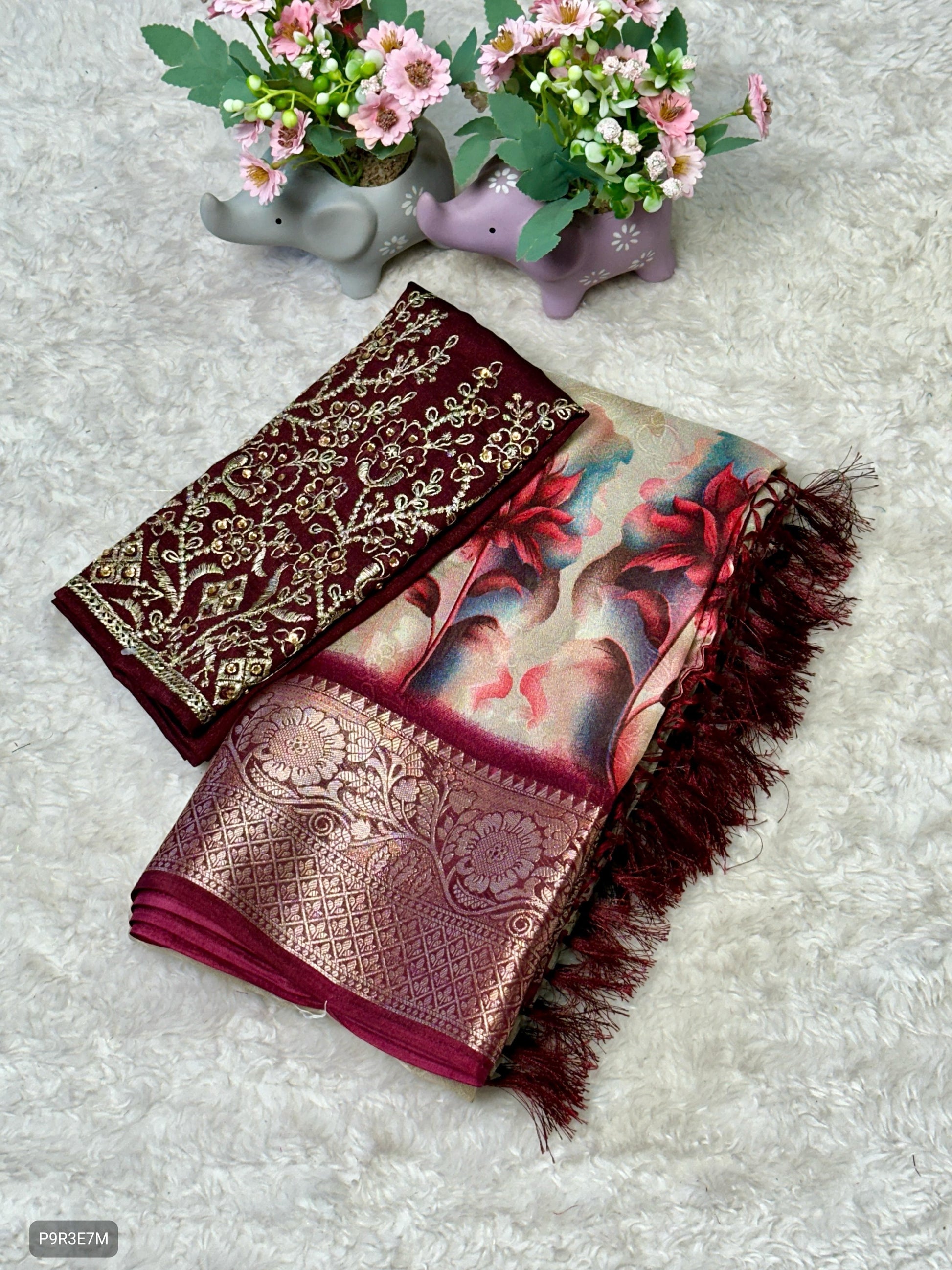Dola Silk Saree with Floral Print, Jacquard Border & Embroidered Stone Work Blouse