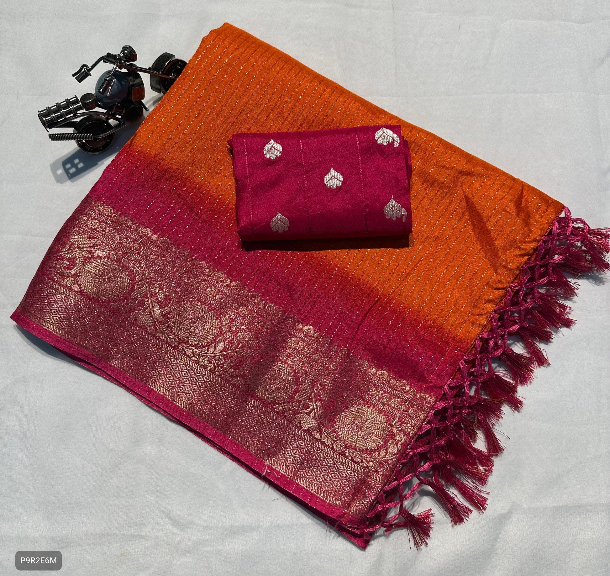 Add timeless elegance to your ethnic wardrobe with this graceful Dola silk saree, adorned with delicate jhalar (tassel) detailing. Crafted for festive occasions and celebrations, this saree comes paired with a complementing blouse piece, making it a complete ensemble for a classy and traditional look.
