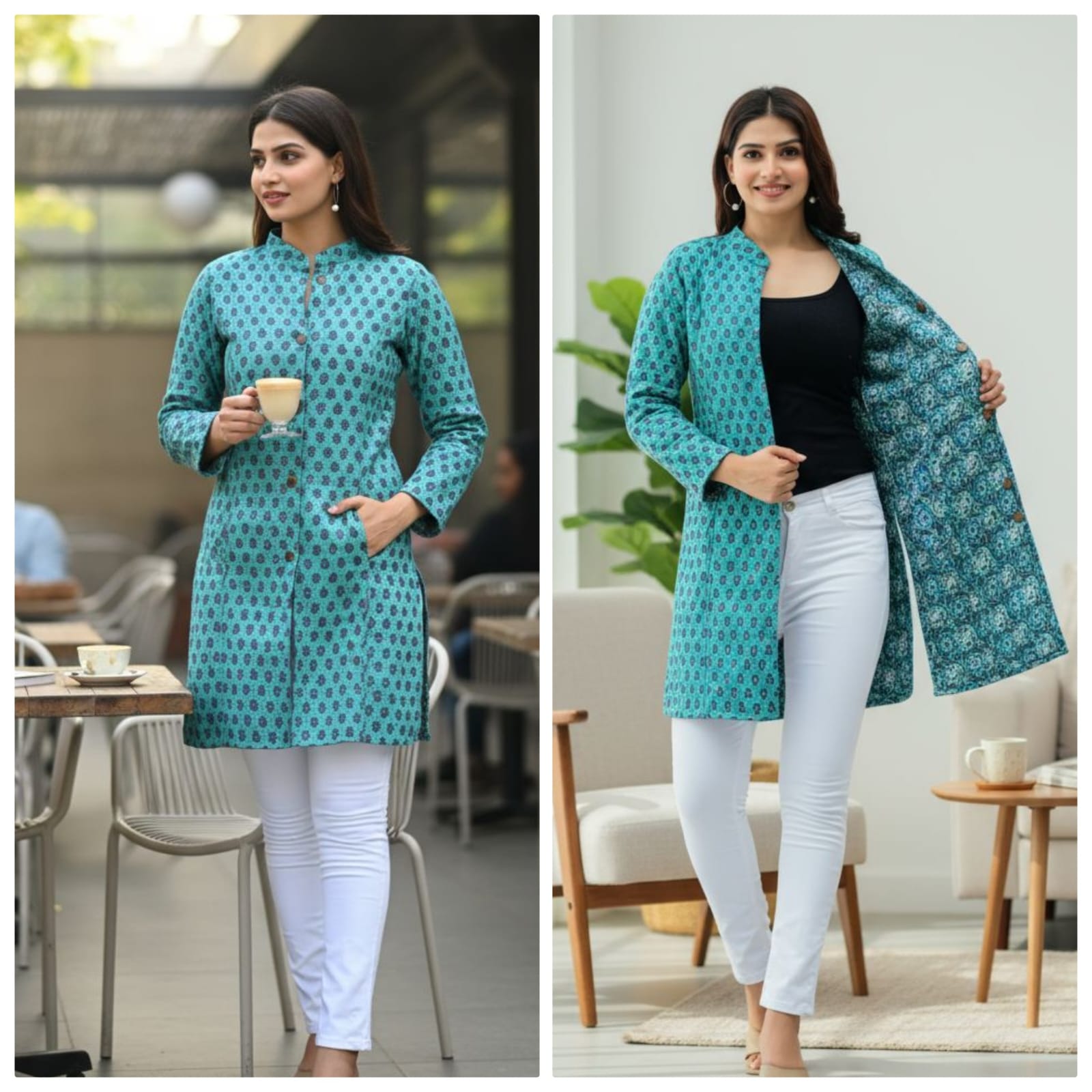 Reversible Quilted Cotton Long Coat with Pockets